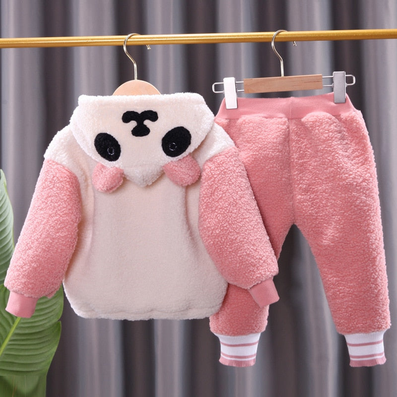 Keep your kids warm and comfortable in winter with our panda hooded sweatshirt and pants set, for kids to 0m to 4 years old.