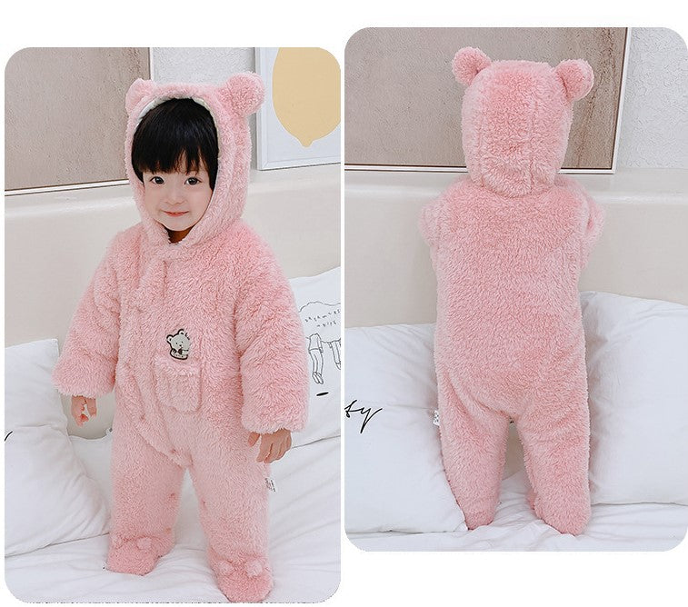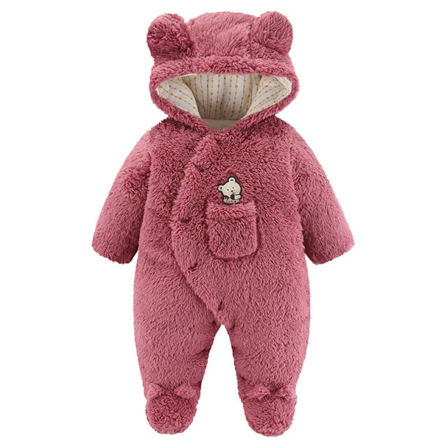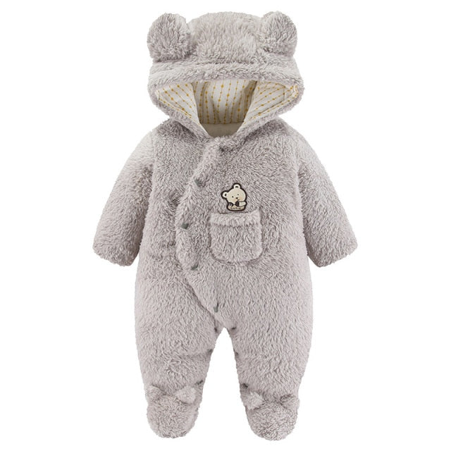 This fun teddy bear hooded jumpsuit, made for boys and girls, with a frontal pocket is perfect for keeping babies super warm and comfy on the coldest of days. The teddy bear ears on the hood give a touch of irreverence, making the piece even cuter.