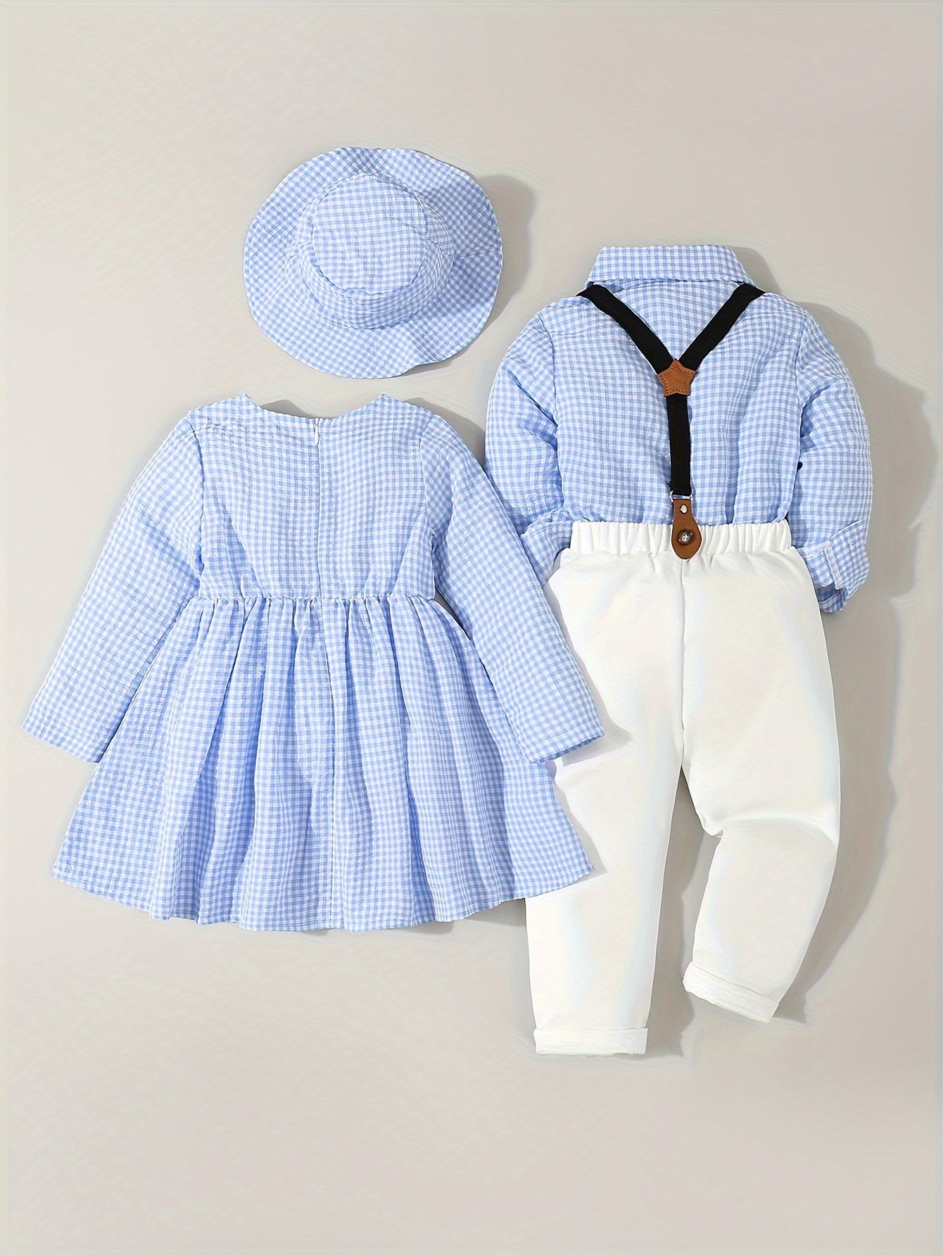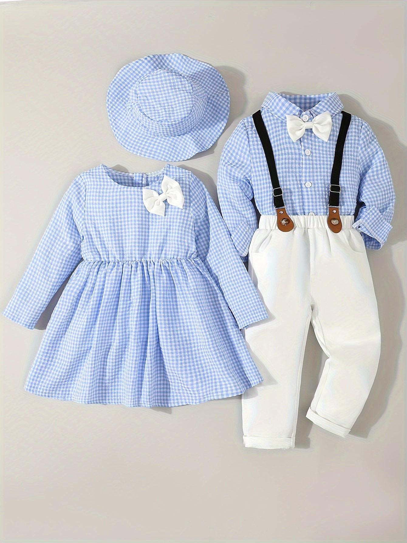 Dress your little ones in this adorable brother and sister matching set. The girl’s blue plaid, waist-curved long-sleeved dress with a cute bow and matching fisherman hat pairs perfectly with the boy’s gentleman-style plaid shirt with bow tie and elastic waist trousers. Designed for formal events like birthday parties, weddings, or performances, these outfits are perfect for making a stylish statement.