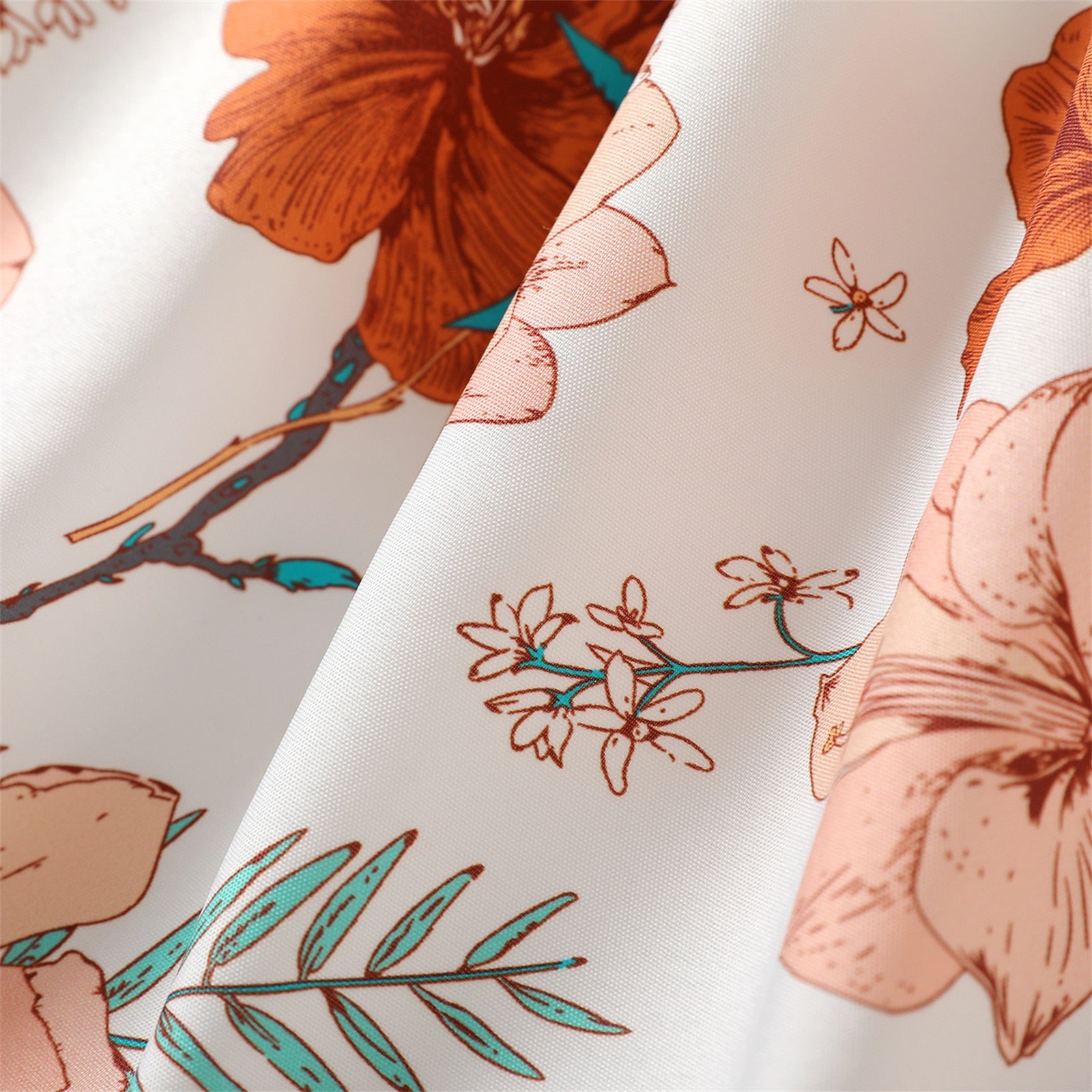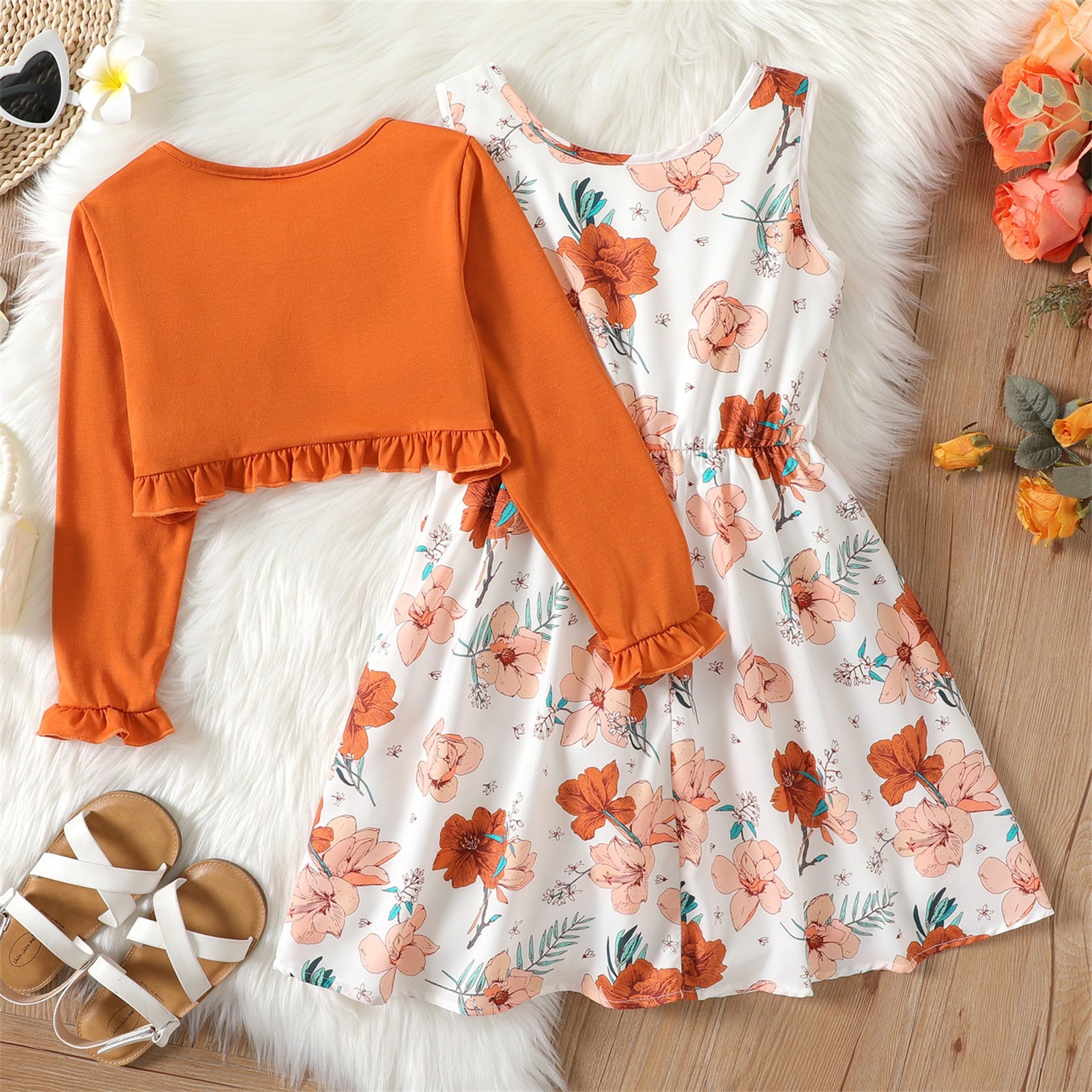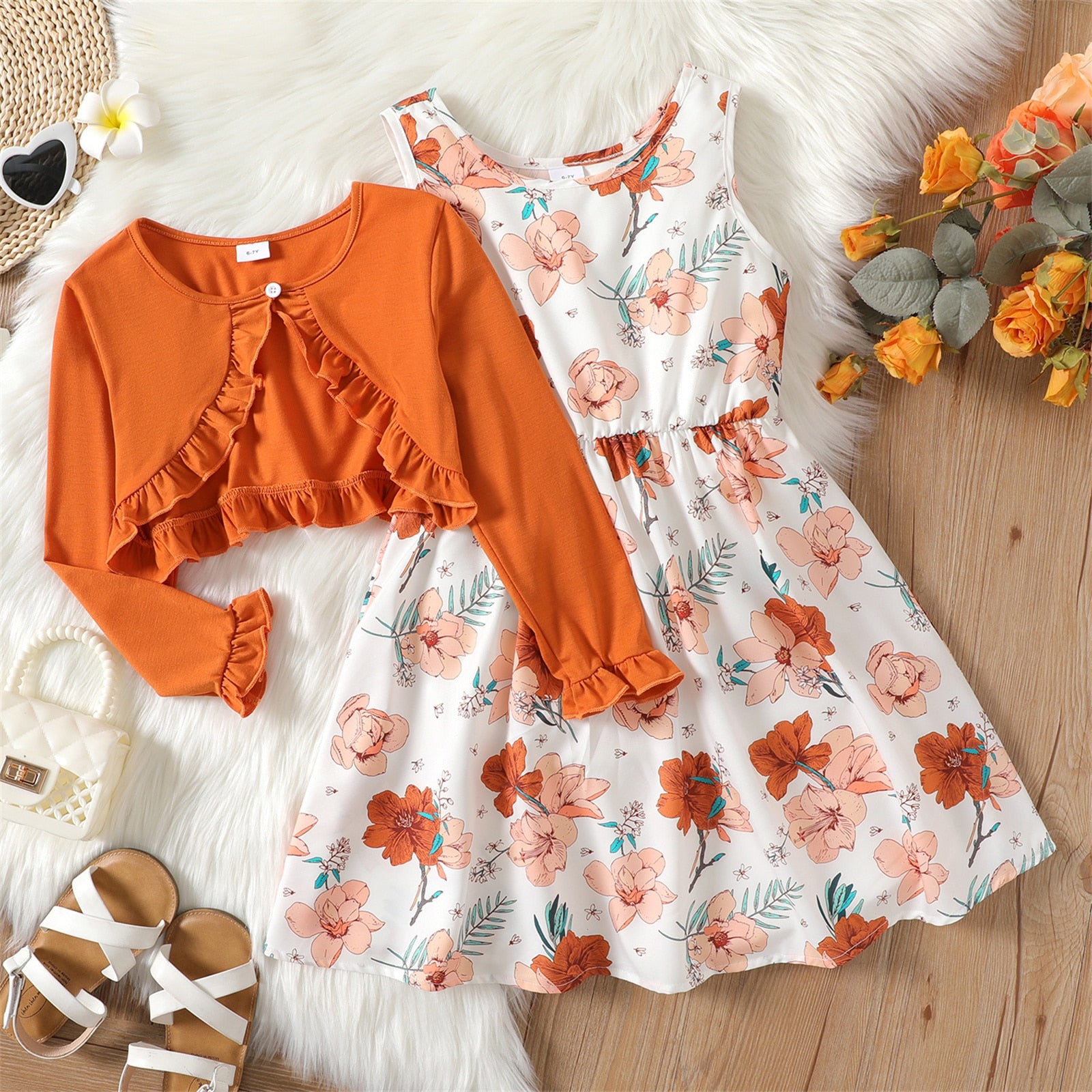 Adorable floral dress with ruffled cardigan, perfect for the lighter seasons like summer, spring and autumn. Made of 95% Polyester, 5% Spandex.