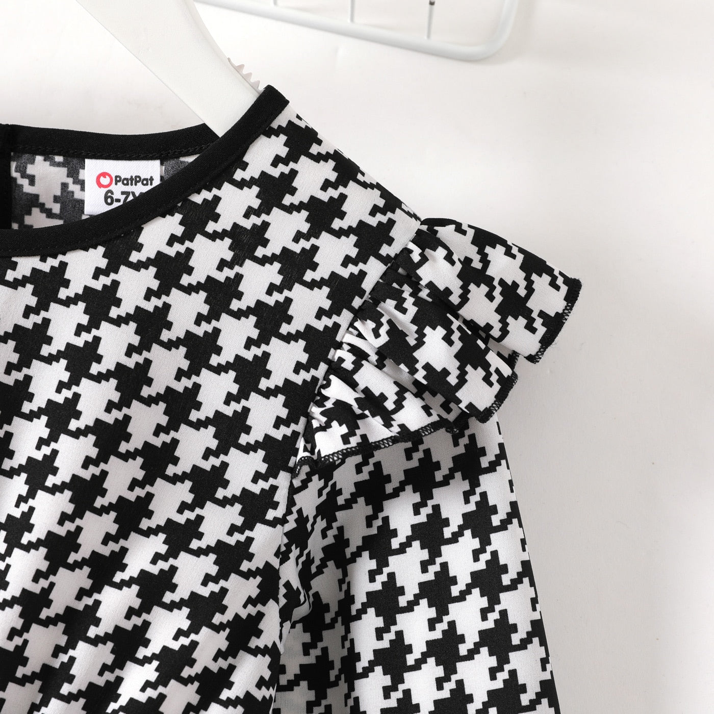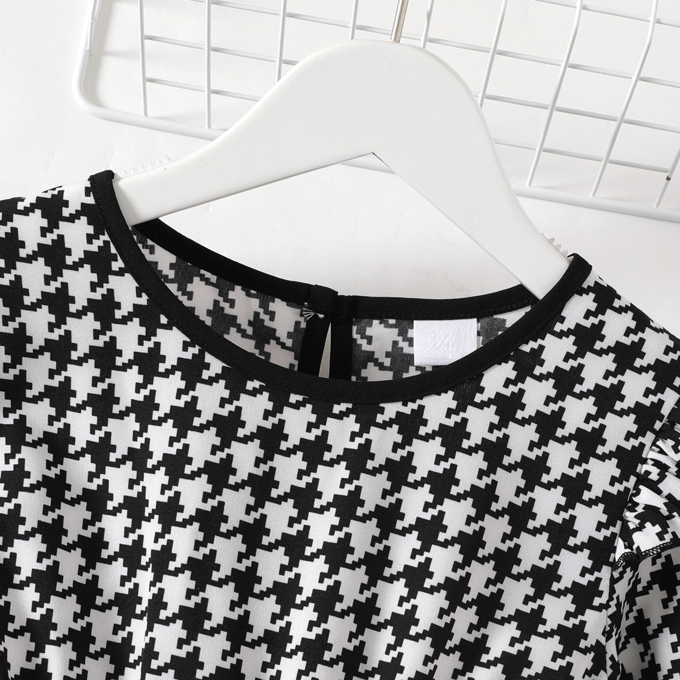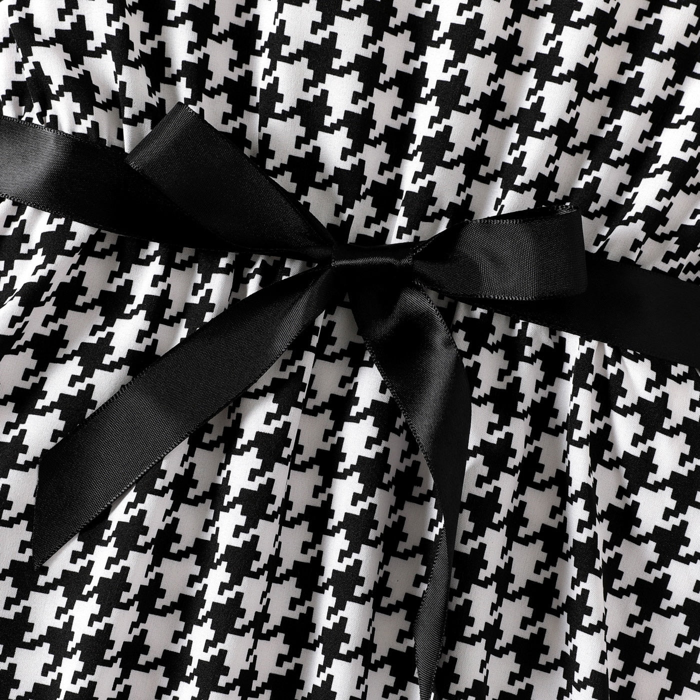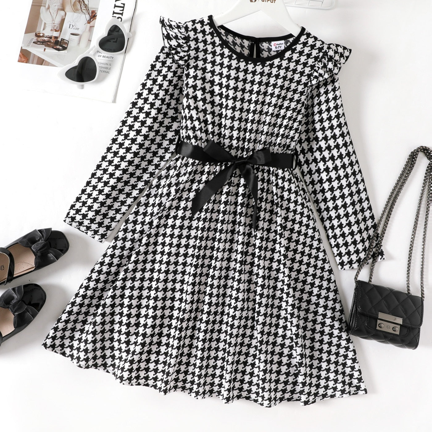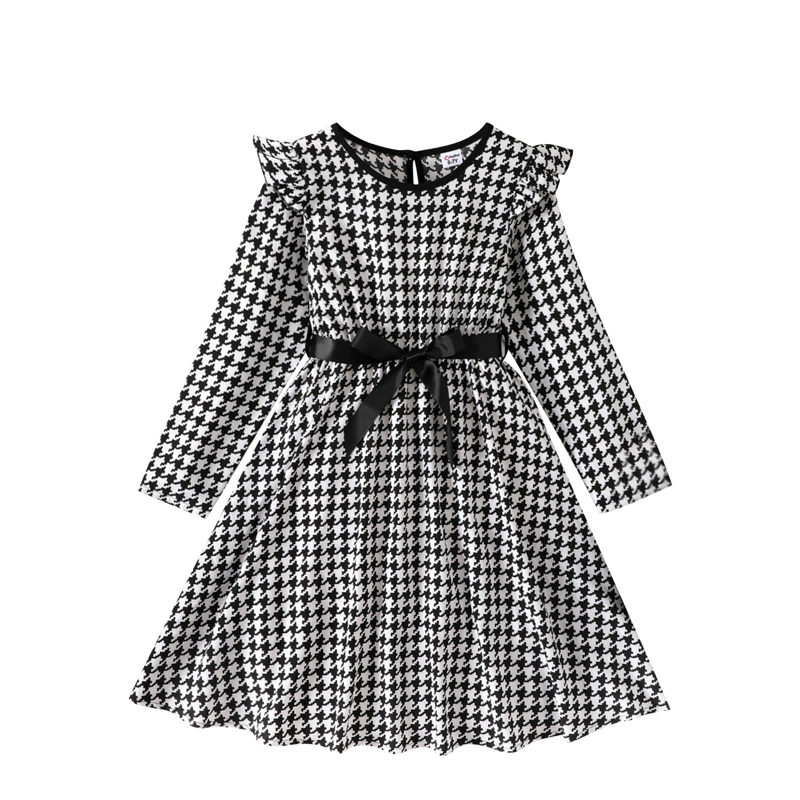 Elegant black and white dress with ruffles, tweed print, long sleeve and front tie, perfect for seasons like autumn, spring and winter.